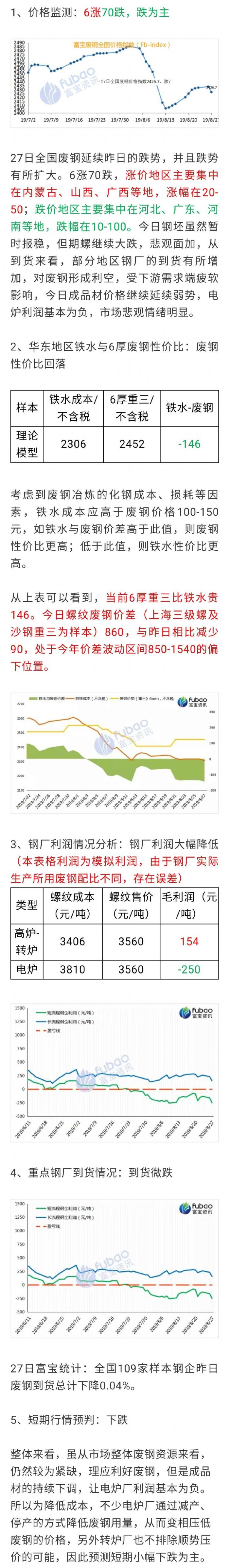 数据看废钢:钢厂利润再次大跌,废钢承压(2019.8.27)