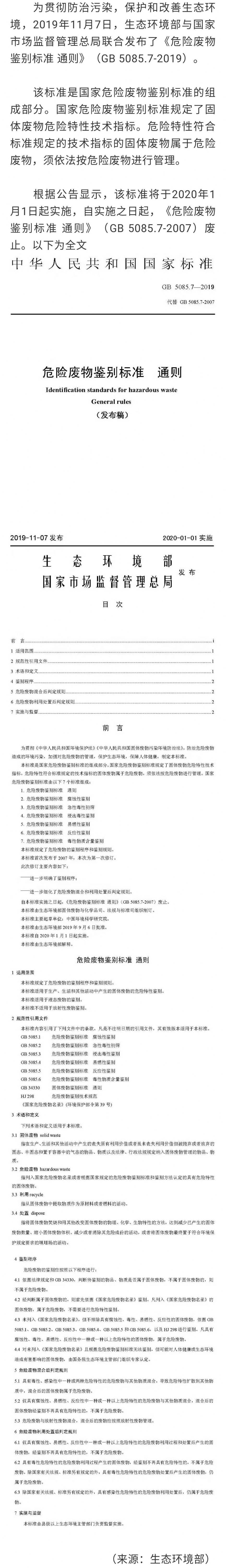 新《危险废物鉴别标准通则》公布2020年1月1日实施